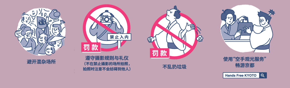 京都不仅为游客和居民提供众多历史遗迹和热情好客的服务,还拥有宁静的自然风光和不断发展的文化。为了更好地保护京都的魅力,我们恳请您遵守以下观光指南。