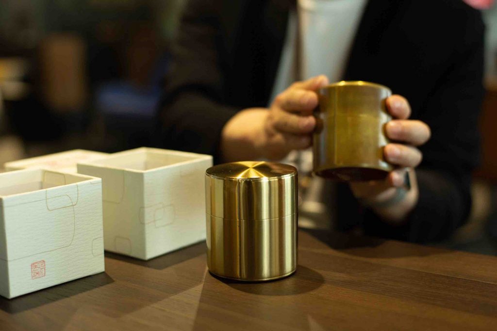 首先,他们选择黄铜作为茶叶罐的材质。黄铜的魅力在于其细腻的色调,以及随着岁月流逝而变幻的光泽和色泽。触摸时,触感却毫不生硬。珍惜产品的岁月,是一种全新的价值观。盖子顺滑地滑下并闭合的方式,早已是开化堂茶叶罐的标志性特征;然而,中川却要求将盖子下落的速度做得更慢一些。