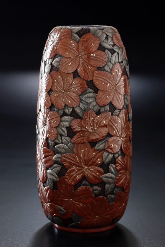 Nakamura’s work features three-dimensional carved floral patterns. He says, “I’m trying to express natural shapes in metal. They are fascinating.”