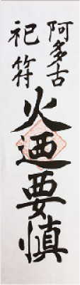 En las cocinas de los hogares y restaurantes, es común encontrar un talismán inscrito con las palabras “Atago Shifu Hi-no-Yojin” (阿多古祀符火迺要慎), que se puede traducir directamente como “El talismán del Santuario Atago: maneja el fuego con sumo cuidado”. Se cree que colgarlo ofrece protección contra el fuego.