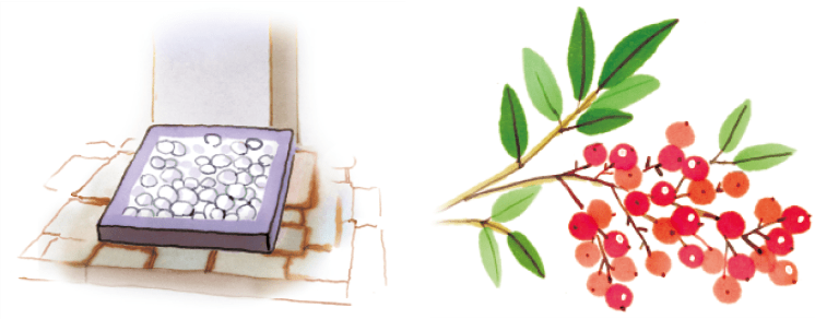 En la esquina noreste de una casa o terreno edificable, a veces se ven pequeñas piedras blancas ordenadamente dispuestas en un cuadrado. Esta costumbre busca brindar protección contra el...kimono" (Puerta del Demonio): la dirección noreste, que se cree que es la entrada de los espíritus malignos. Otra práctica común es plantar un nante (bambú celestial) árbol del noreste. En japonés, nanten suena igual que "nan-ten" (literalmente, "alejar la desgracia"), por lo que se cree que esta planta tiene el poder de alejar el mal.