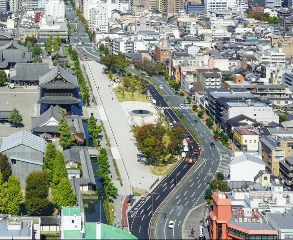 Although the area around Kyoto Station is filled with office buildings and large commercial facilities, you’ll soon encounter the impressive Goeido Gate of Higashi Hongan-ji Temple. The forecourt has been redeveloped into a spacious plaza with wider sidewalks and clean public restrooms. Continue west along Shinhanaya-cho Street to Horikawa Street, where Nishi Hongan-ji Temple—another World Heritage site—comes into view.