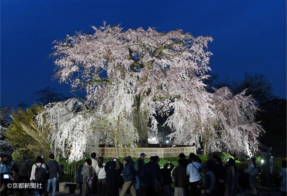 En pleine floraison, ses branches se parent de fleurs rose pâle qui lui confèrent une allure majestueuse. Illuminé la nuit, il attire des foules venues du monde entier, émerveillées par sa silhouette blanche et éthérée qui semble flotter dans l'obscurité. Le parc tout entier baigne dans une atmosphère chaleureuse et festive qui, alliée à la présence imposante de cet arbre historique, en fait l'un des sites emblématiques du printemps à Kyoto.