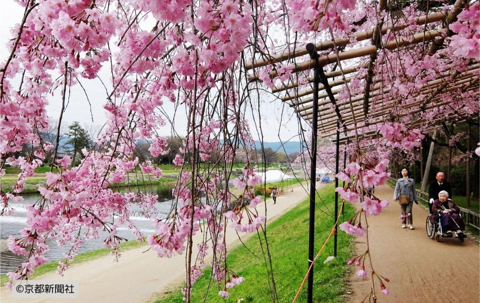 Situé à l'ouest du jardin botanique préfectoral de Kyoto, le sentier Nakaragi est une promenade paisible qui s'étend sur environ 800 mètres le long des berges de la rivière Kamo. On y trouve une rangée de cerisiers pleureurs pourpres (Benishidarezakura) en fleurs, formant un rideau retombant de pétales.