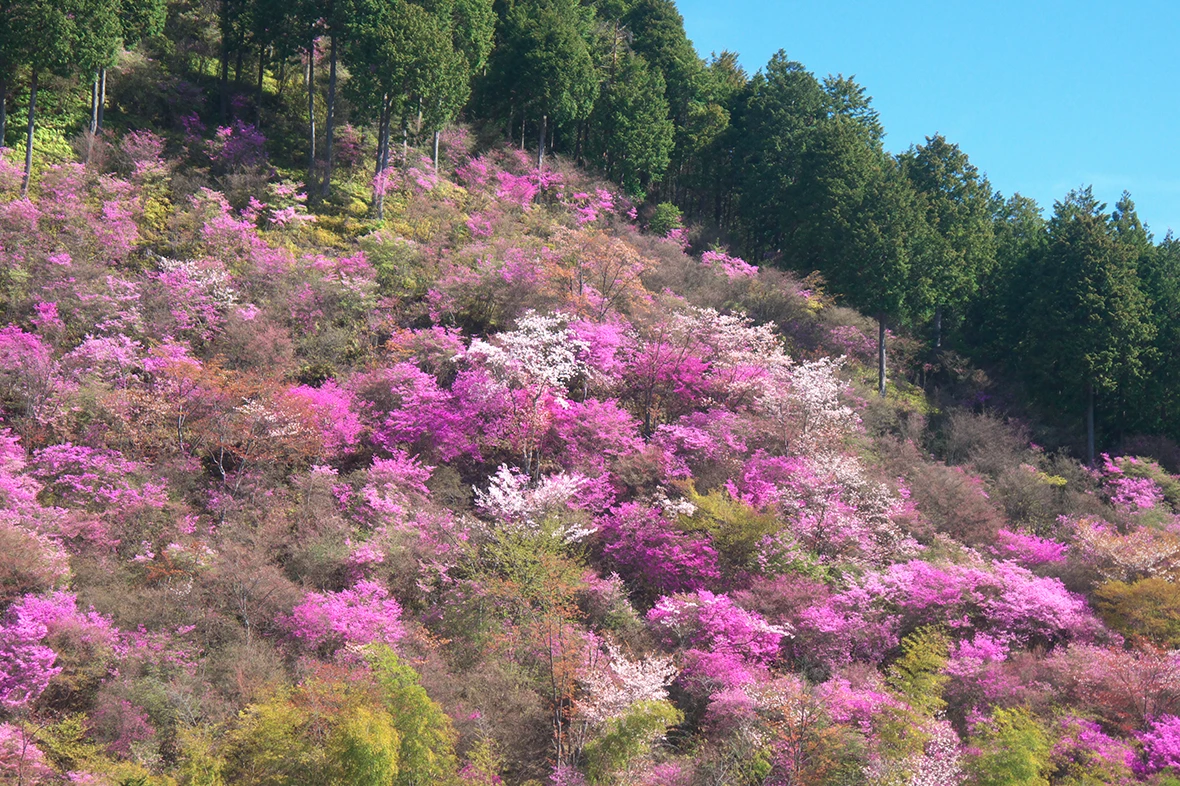 Avec un peu de chance, vous pourrez admirer les azalées sauvages Mitsuba tsutsuji, aux couleurs éclatantes, en fleurs aux côtés des cerisiers en fleurs Yamazakura, qui parent les montagnes de mille couleurs le temps d'un instant. Ici, entouré de montagnes et de rivières, loin du tumulte de la ville, vous pourrez contempler la beauté immuable des cerisiers indigènes du Japon, inchangée depuis mille ans.