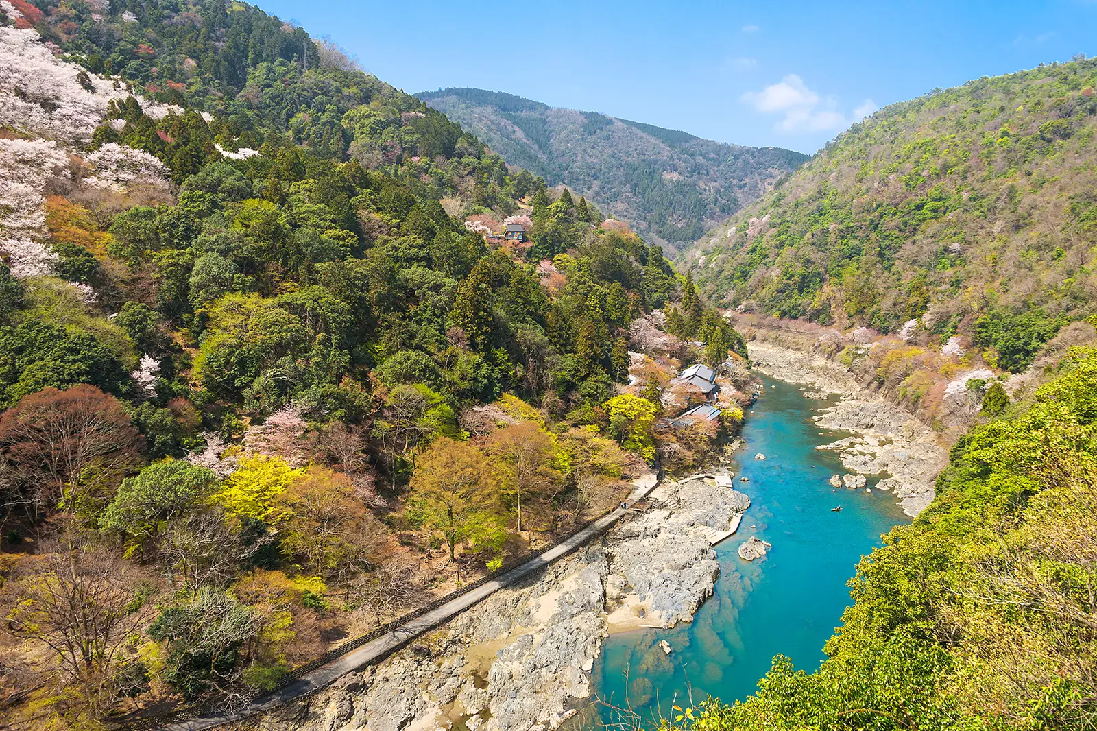 La plateforme d'observation offre une vue panoramique sur la rivière Hozu en contrebas et sur le mont Arashiyama, sur la rive opposée. Au printemps, les flancs des collines se parent des fleurs blanches des cerisiers sauvages de Yamazakura qui semblent flotter au milieu de la végétation luxuriante.