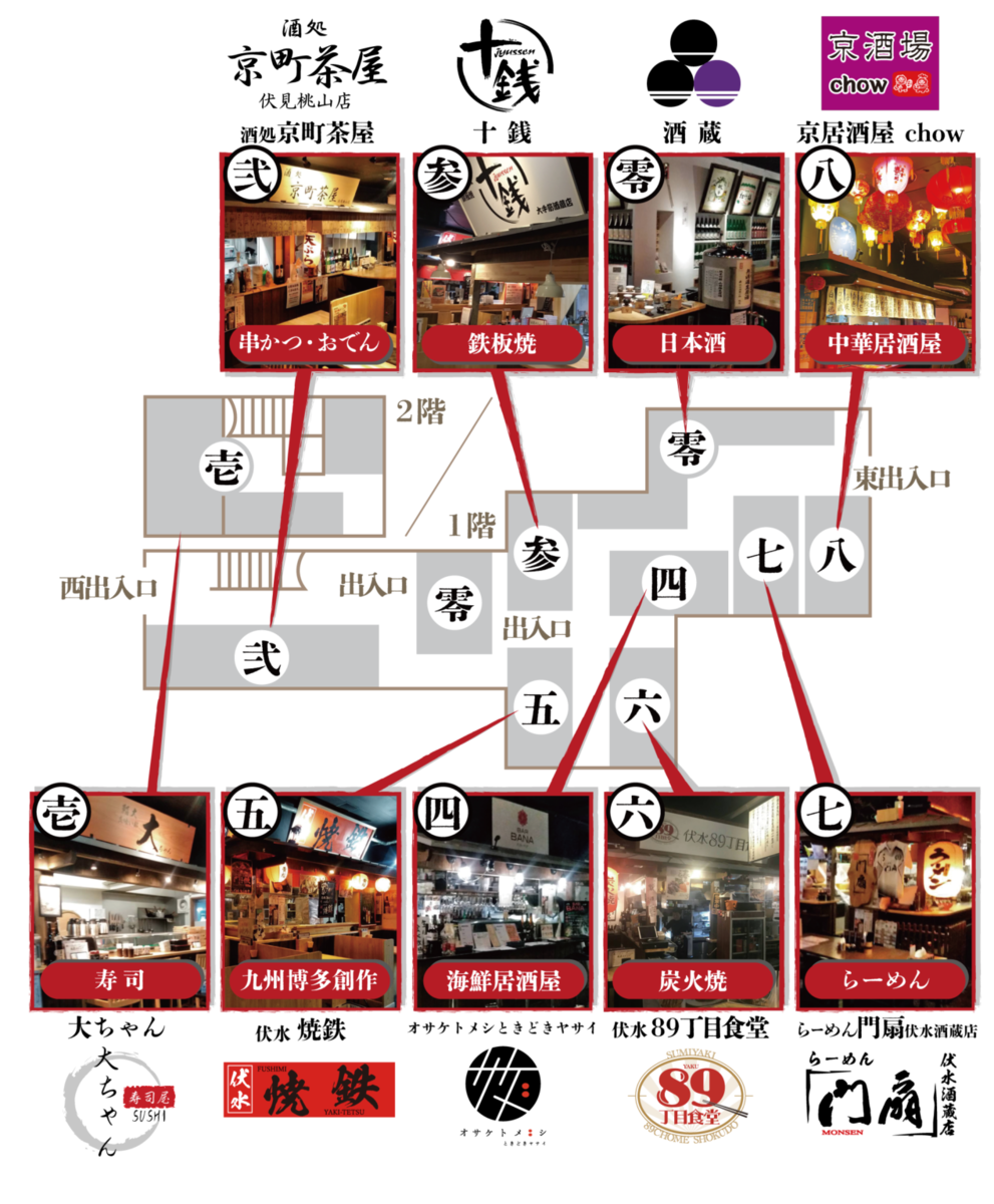‘후시미 사카구라코지’는 여러 음식점이 모여 있는 복합공간입니다. 중식, 오코노미야키, 오뎅, 양식 등 여러 장르의 음식점이 있으며, 어느 요리든 후시미의 사케와 훌륭한 조화를 이룹니다.