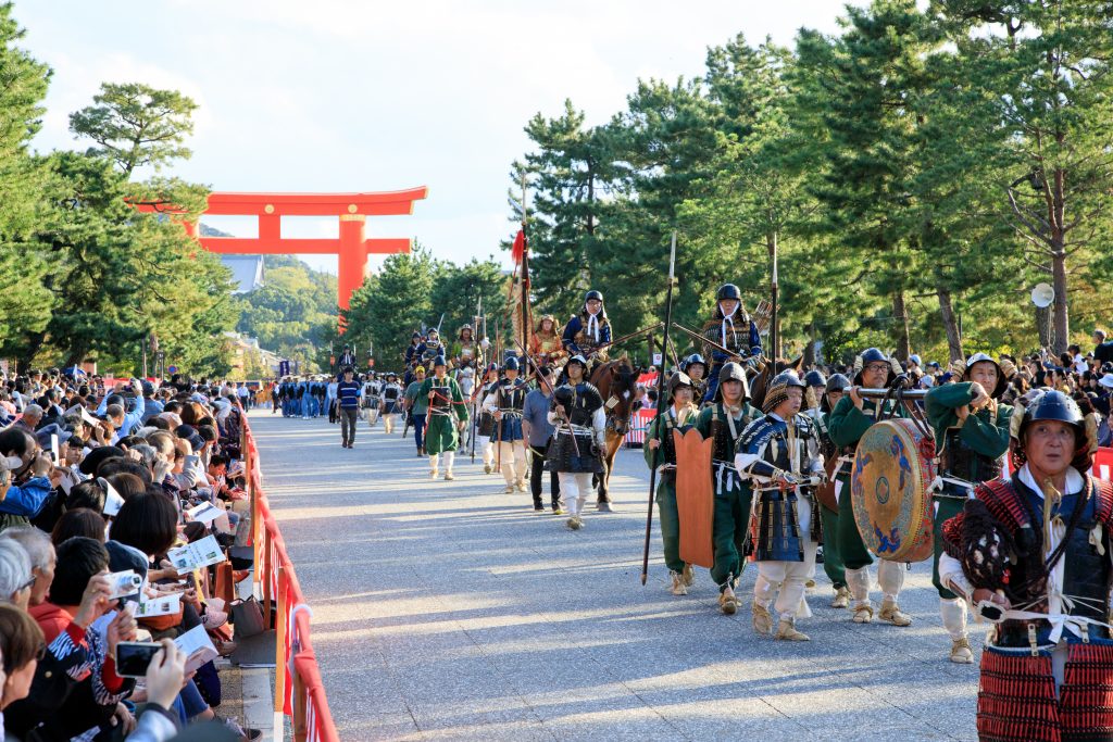 遷都京都的桓武天皇和京都最後一位統治天皇孝明天皇的靈位,都會被乘坐名為“禦寶蓮”的神車,以祈求京都保持安全、繁榮昌盛。各時代的歷史性遊行隊伍會陪伴他們從京都御苑返回平安神宮。