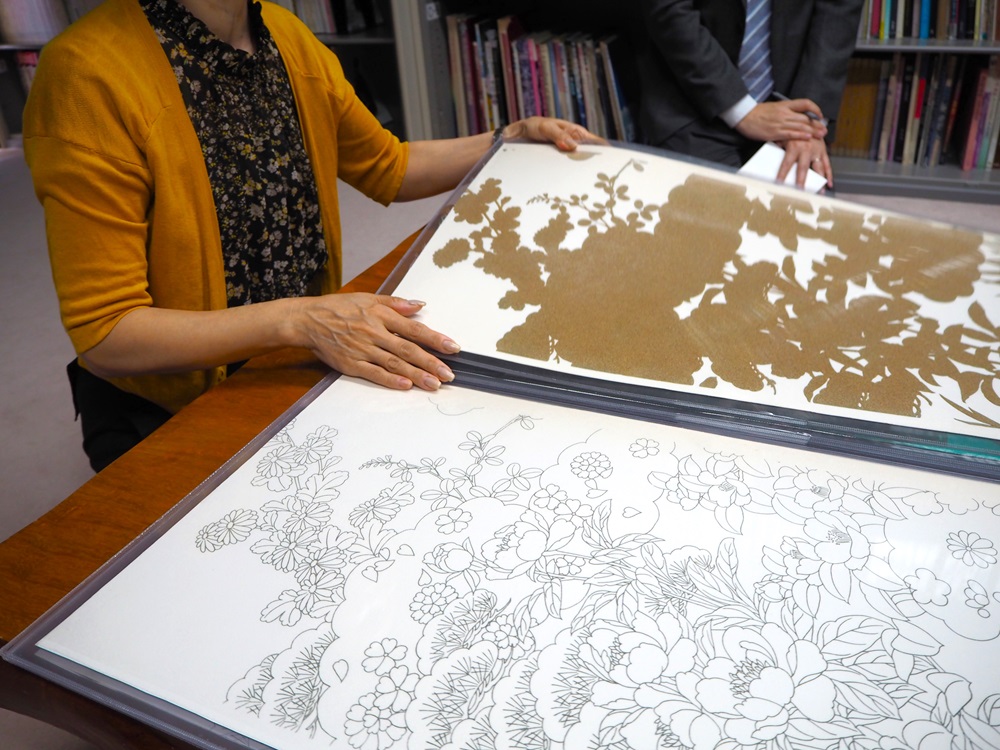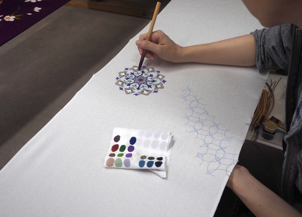 創作一幅完整的京友禪畫需要大約二十道工序,每一道都由技藝精湛的專家完成。岡山工藝負責其中大約五到六個步驟,從構圖到手繪完成。