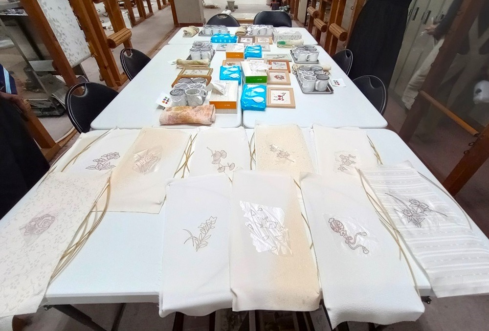 工匠一筆一筆地在白色布料上精心作畫。