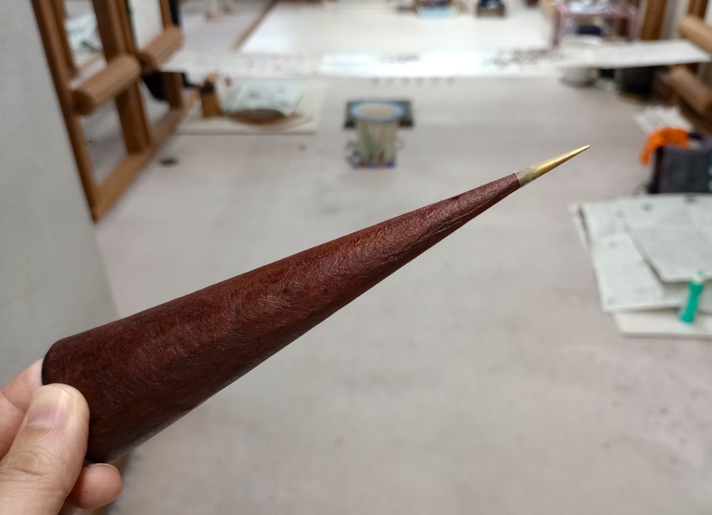 使用費力的工藝來塗抹防染劑,該工藝使用一個開口細如針尖的金屬尖端,連接到一根用柿澀(一種由柿子單寧製成的防水溶液)處理過的日本紙製成的小管上。